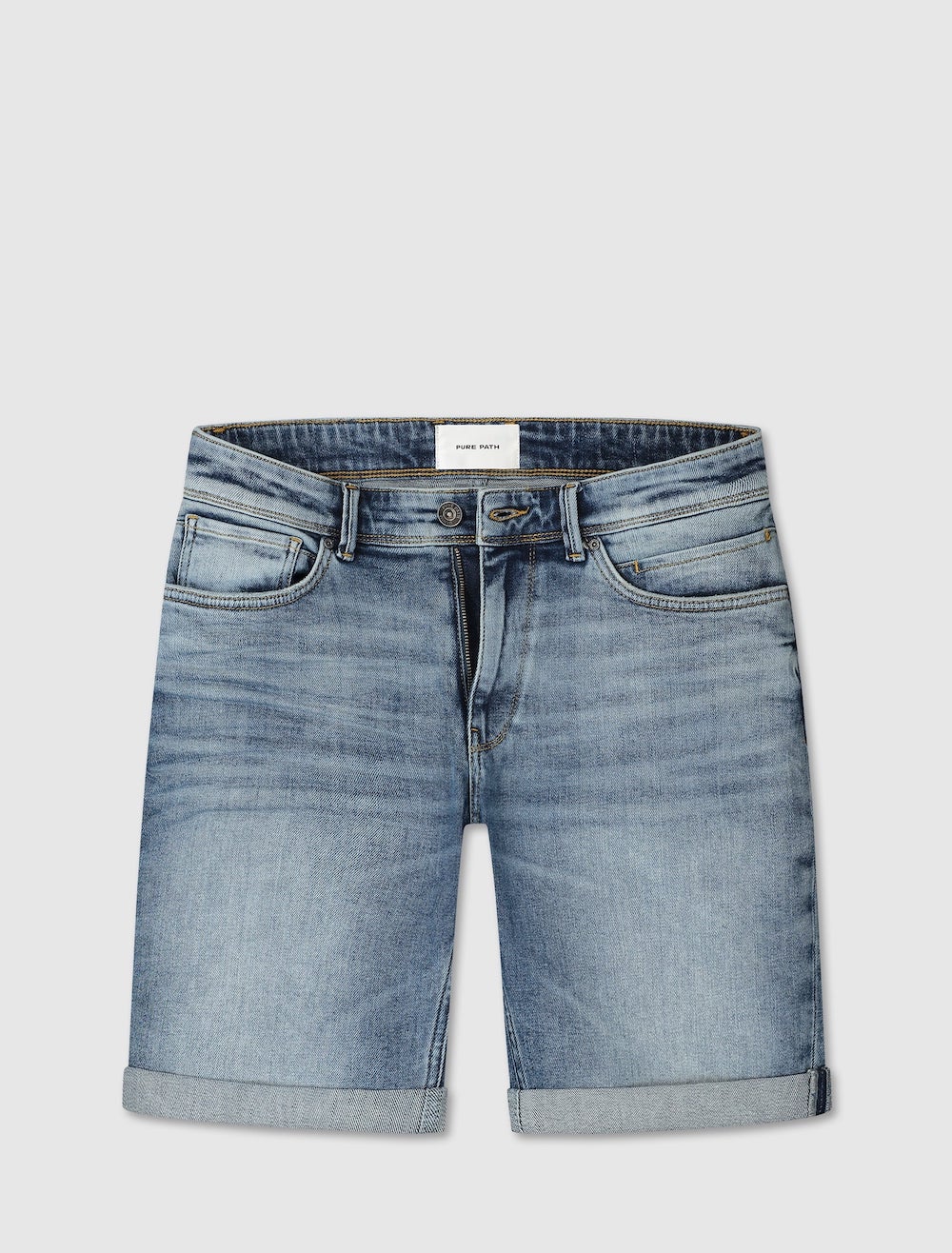5-pocket denim short van Pure Path met een knoop- en ritssluiting en een omslag aan de pijpen. Materiaal: Katoen 99%| elastan 1%