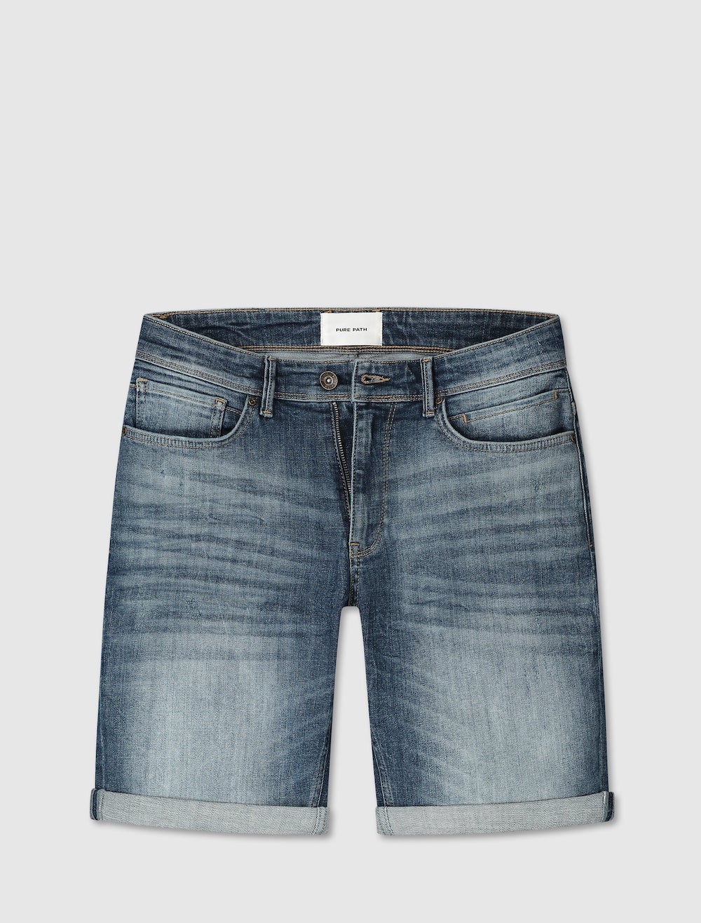 5-pocket denim short van Pure Path met een knoop- en ritssluiting en een omslag aan de pijpen. Materiaal: Katoen 95%| polyester 4%| elastan 1%