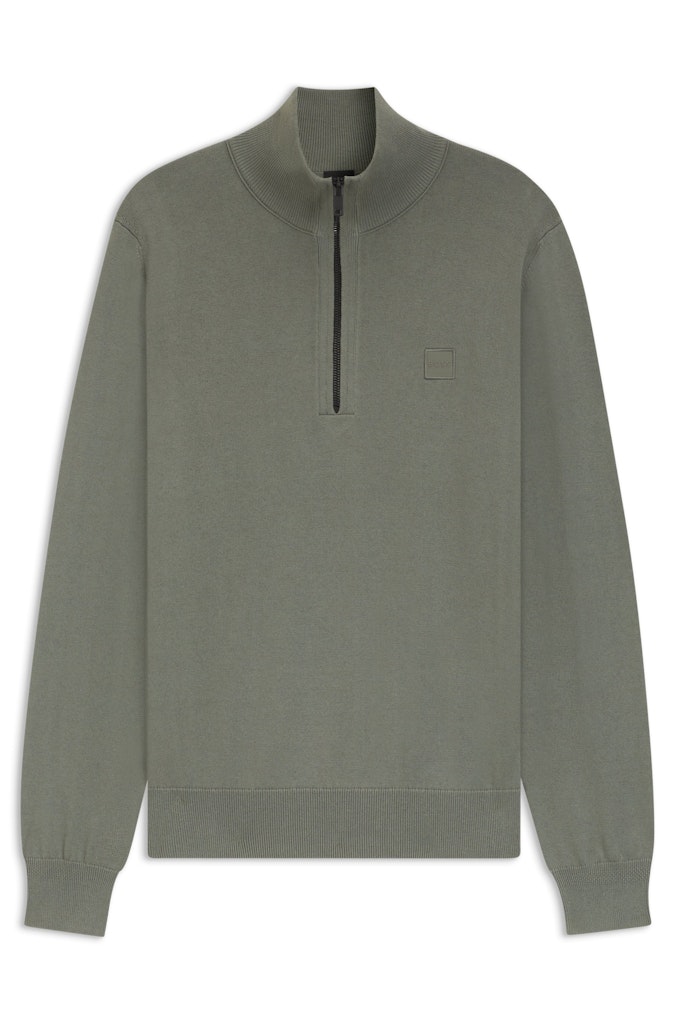 Trui van Boss Orange met lange mouwen, opstaande kraag voorzien van korte ritssluiting, logo op de linkerborst en ribgebreide boorden. Materiaal: Katoen 9%5| kasjmier 5%