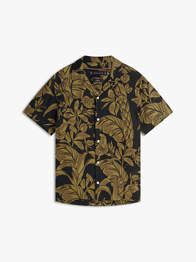 Linnen overhemd van Tommy Hilfiger in een all-over dessin met korte mouwen, knoopsluiting, cubaanse kraag en geborduurd Tommy Hilfiger-vlag op de mouw.